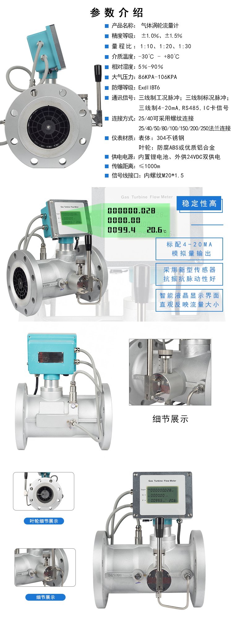 一體化氣體渦輪流量計結構為防爆設計,可以顯示流量總量,瞬時流量和流量滿度百分比。電池采用長效鋰電池,單功能積算表電池使用壽命可達5年以上,多功能顯示表電池使用壽命也可達到12個月以上。