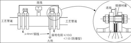 2、電磁流量計安裝在具備陰極掩護的金屬管道上,安裝時用≥6mm2銅線將管道與管道相銜接,用≥4mm2銅線將接地法蘭(接地環)與電磁流量計相銜接,接地線從電磁流量計法蘭上接入接地網。